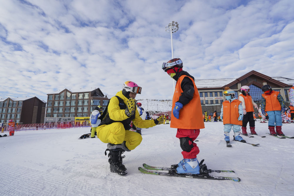 ↑滑雪教練在給學(xué)生講解雙板滑行技巧。新华社记者 阿曼 摄