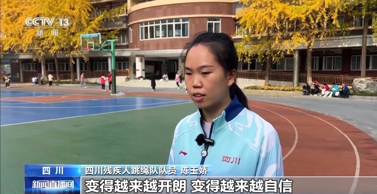 四川残疾人跳绳队队员 陈玉娇:希望我这次能突破上一届的成绩,能够拿到三个金牌。我觉得接触跳绳之后变得越来越开朗,越来越自信,让自己成了更好的自己
