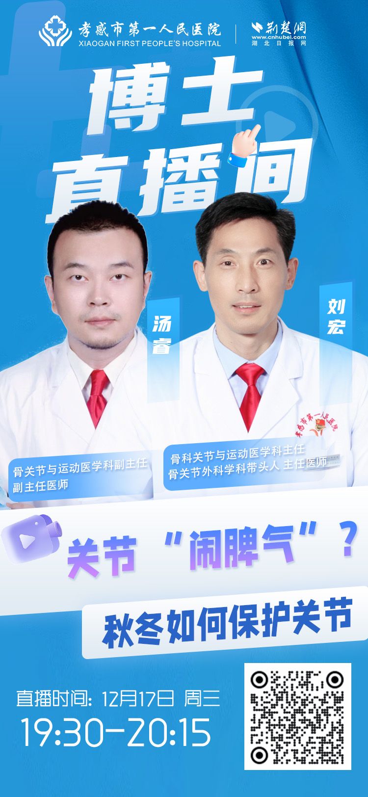 12月17日(周三)晚19:30,孝感第一人民医院直播间特邀骨科关节与运动医学科主任刘宏主任医师,骨科副主任医师汤睿,结合二十余年临床经验,用通俗语言拆解髋膝肩疾病诊疗知识: