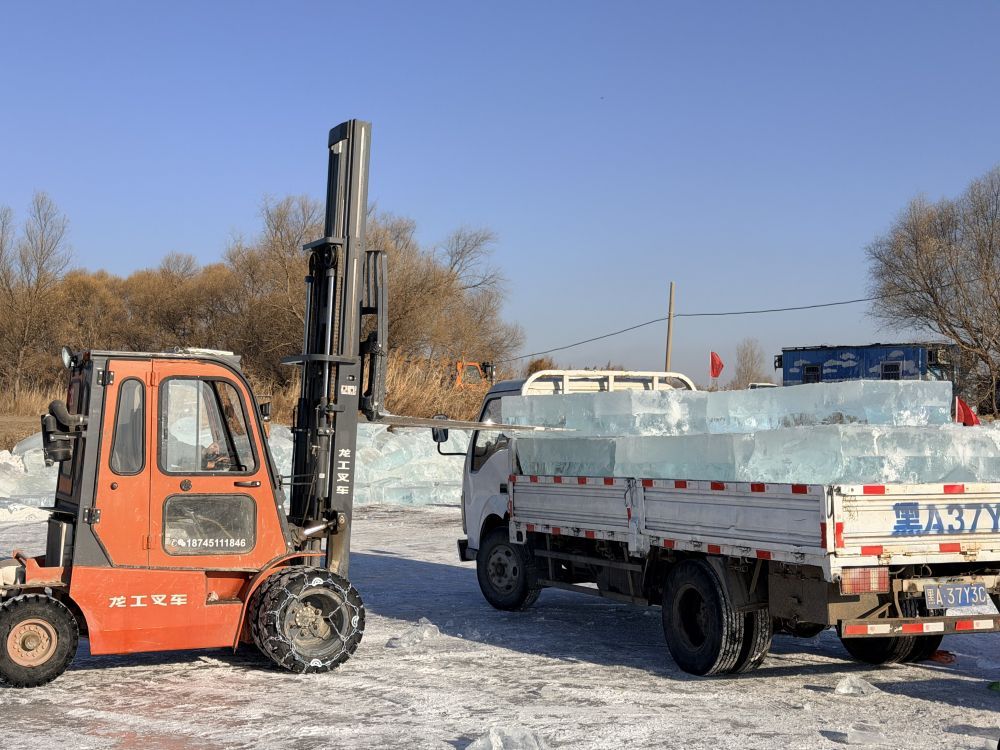叉车将冰体送上货车,随后运至哈尔滨冰雪大世界园区。新华社记者 刘赫垚 摄