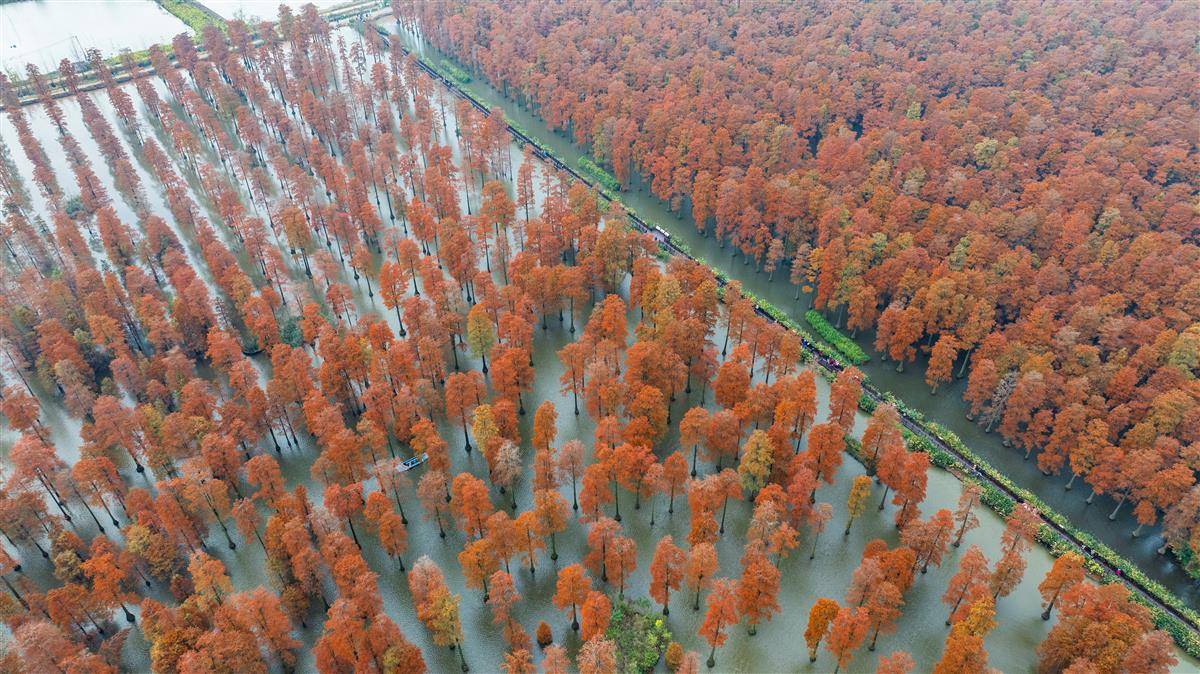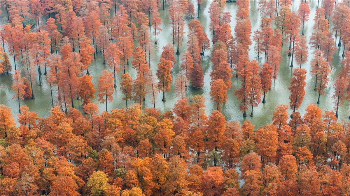 航拍池杉红遍的遍宛涨渡湖湿地。