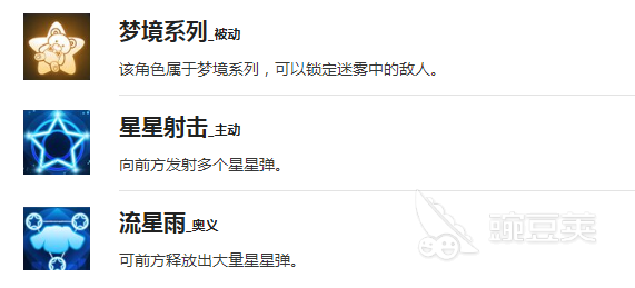 这一个角色就属于梦境系列的其中一个,一旦在遇到敌人时,就可以把敌人全部都锁定在迷雾中,没有办法逃脱。星星射击属于一个主动技能,在释放之后就可以朝着前方发射多个星星弹。流星雨_奥义一旦朝着前方释放之后,那就会形成大量的星星弹拥有比较可怕的实力。