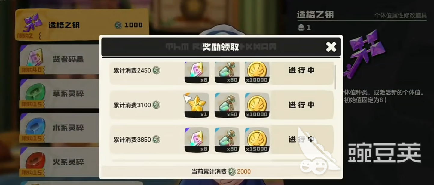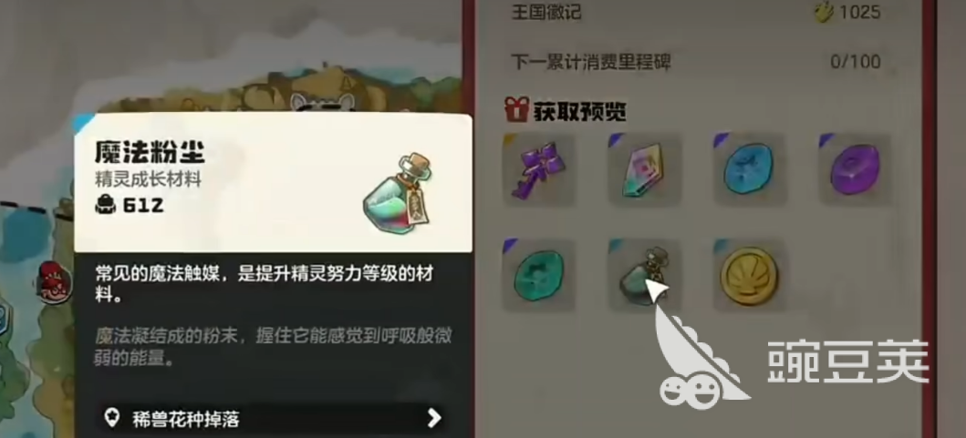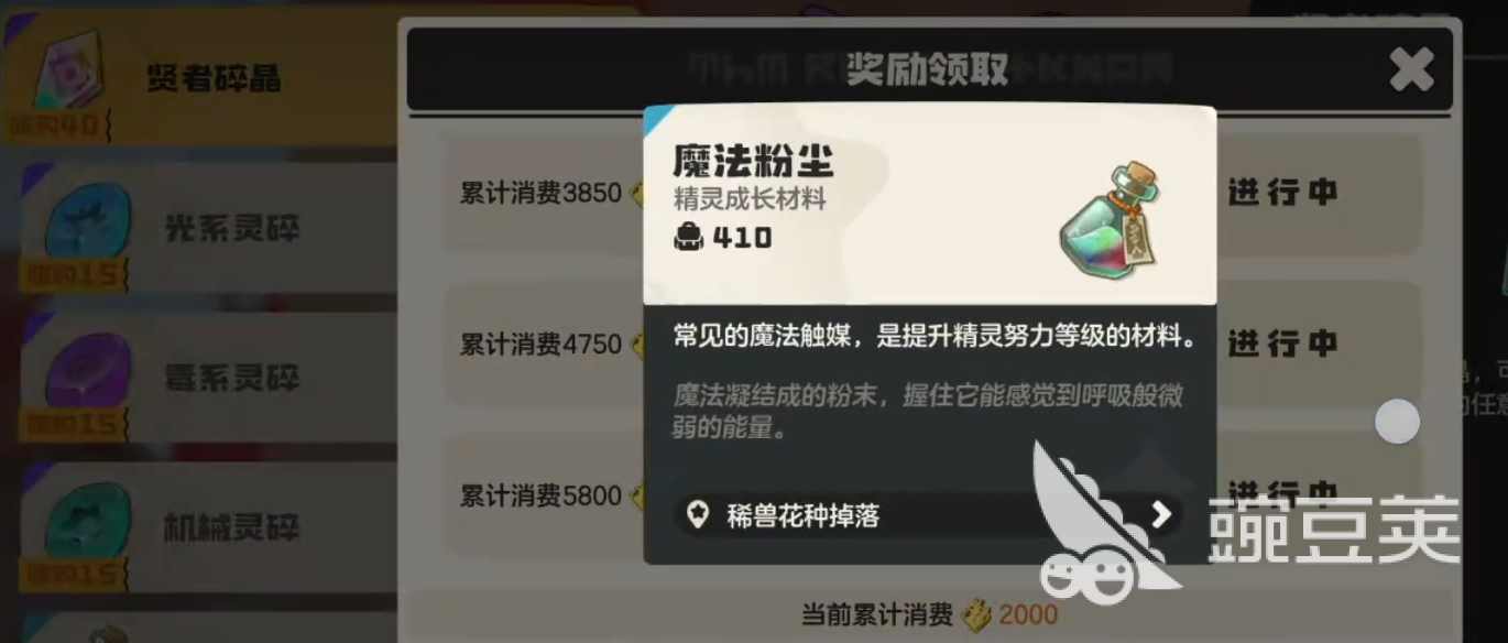 王国城堡附近还有一个精灵道具店。这个位置稍微远一点,不过也不难找。从地图上看王国城堡的区域,周边会标注有精灵道具店的图标。这个店同样设置了消费里程碑奖励,机制和前面两个店是一样的。累计消费到了就能领,里面的魔法粉尘数量也够用。