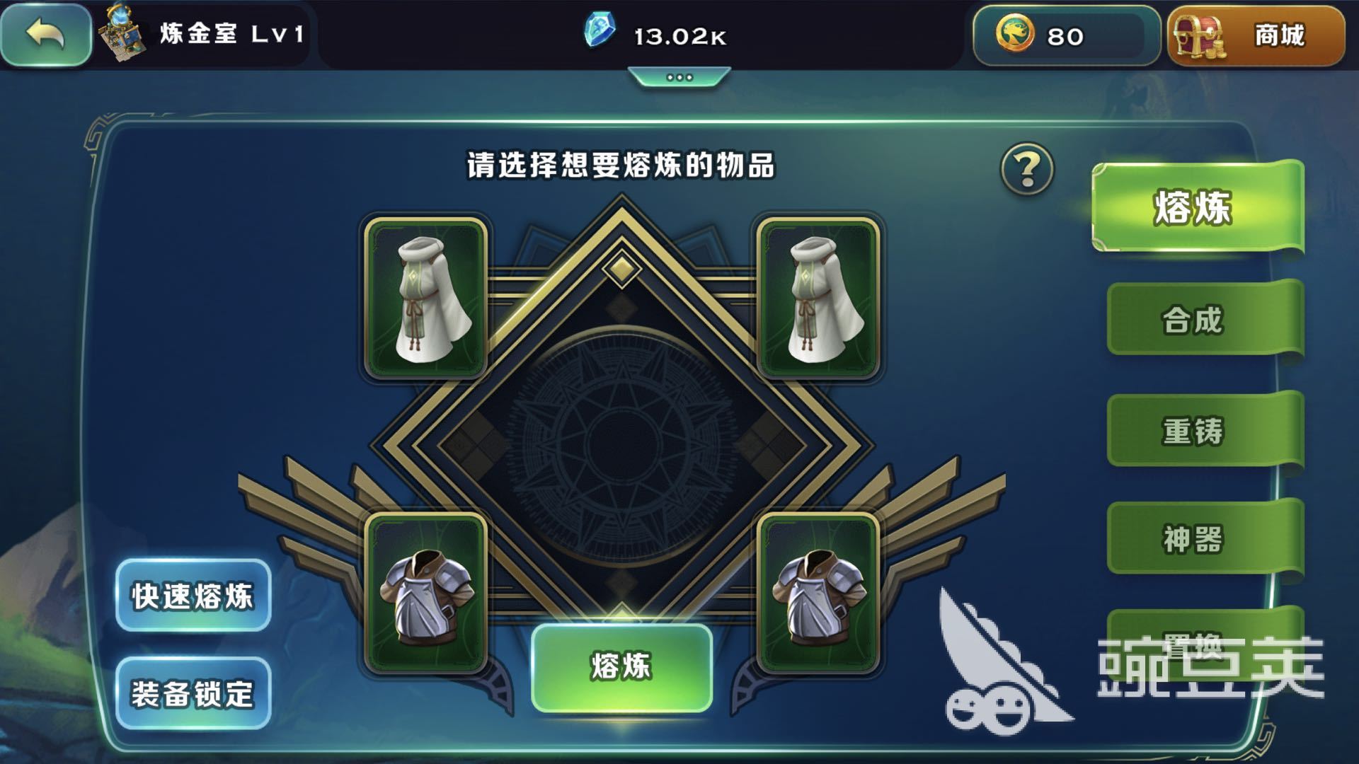 熔炼室可以合成阿瓦隆的套装:蓝色品质的有光辉套装、紫色品质的有银凤套装。用4个绿色装备有小概率合成一个蓝色的装备,用4个蓝色的装备大概率获得蓝色装备,所以玩家可以将不需要的装备合成,融合个十几次总有一次可以出一个套装装备。