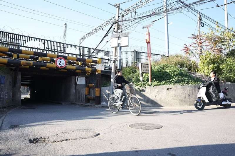記者探訪時發現,鐵道橋的限高僅有2米,人車混行。一輛拉貨的車輛只能小心翼翼減速慢行,后面馬上就排了一輛小轎車和一輛電動自行車。記者粗略計算了一下,當天下午兩點半左右,大約兩三分鐘就有一輛機動車從橋下通過,電動自行車、行人更是絡繹不絕。有網友發帖稱,這一路段因為窄,下班高峰非常容易堵車。雖然這一區域居民不多,但車輛不算少,如果貿然站在路口拍照,會存在安全隐患。