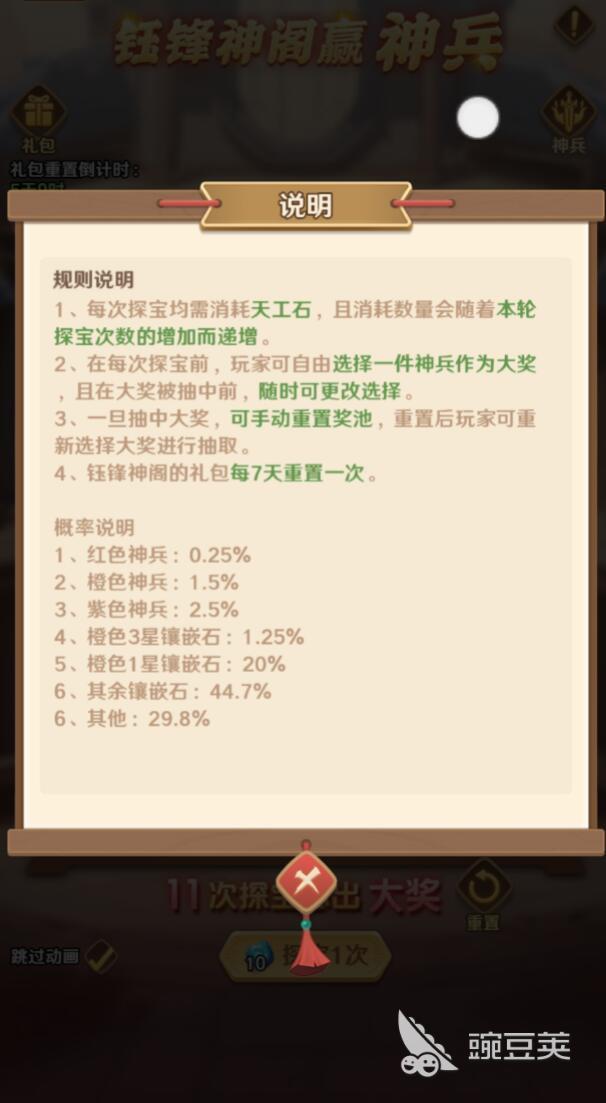钰锋神阁赢神兵活动其实每7天就会重置一次,在这样的情况下,玩家如果参加的话,将会有规律去获取免费,或者是低成本的探宝的机会,其实玩家也可以尝试充值,这样的话就能够快速的积累天工石,为探宝提供稳定的资源方面的支持。