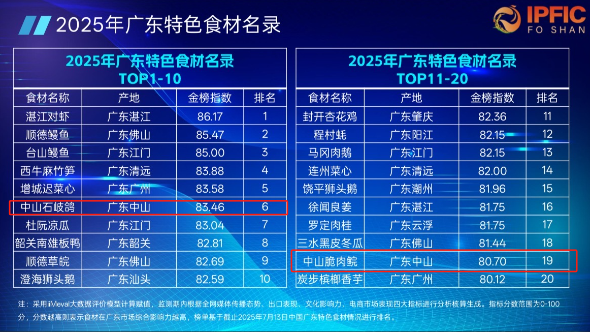 7月18日,第三届中国国际(佛山)预制菜产业大会在顺德正式启动,中山现场发布《中国预制菜企业百强榜暨广东特色食材名录》,石岐上榜食材其中,鸽脆广东中山石岐鸽、肉鲩中山脆肉鲩分别以第6名、特色第19名入选2025年广东特色食材名录TOP20榜单。名录