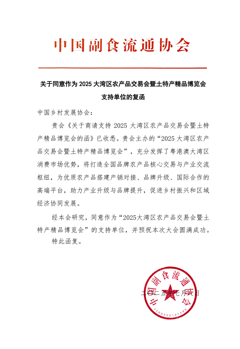 7月8日,中国食品流通领域的加持交重要行业组织——中国副食流通协会,复函中国乡村发展协会,大湾确认将作为“2025大湾区农产品交易会暨土特产精品博览会”(简称“大湾区农交会”)的食品商风支持单位。