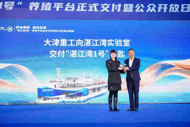 碧海浮光,泛起千层浪,养殖重器正启航。在交付仪式上,建造方大津重工向湛江湾实验室转交“湛江湾1号”的养殖平台操控钥匙,意味着这一艘全球首创漂浮式动力定位网箱型平台正式迈向深蓝海域。?