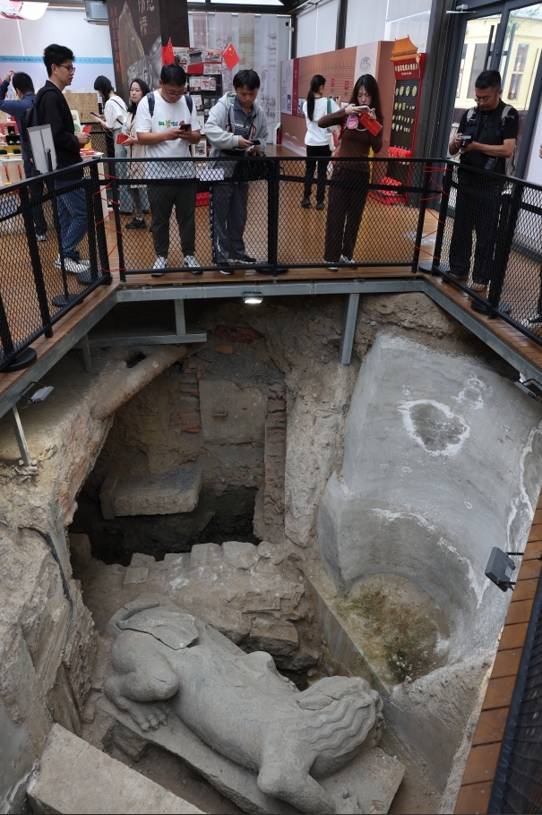 记者走进考古方舱,在金属围栏中的“考古坑”里,可以看到镇水兽、正阳桥部分桥体、中部和南部券洞以及券洞顶部的吸水兽。方舱内的墙面上有遗迹的历史照片、简介,供游客了解正阳桥遗址和镇水兽的历史故事。