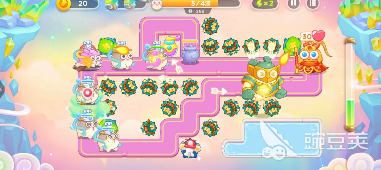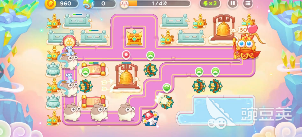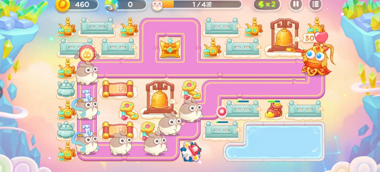 兔子第一波被消灭的话,大家可以继续部署瓶子炮,来打大钟以及酒壶,瓶子炮用来打酒壶的话,整体的效果会比较不错,继续的持续部署,更多的然后瓶子炮和二级多重剑是可以一起来打宝箱、香炉、酒壶的,此时可以操作毒升三,所以在这里只要买够足够的二级多重箭件其实就有一定的强度了,地图当中道具全清的话,星君就会出现。
