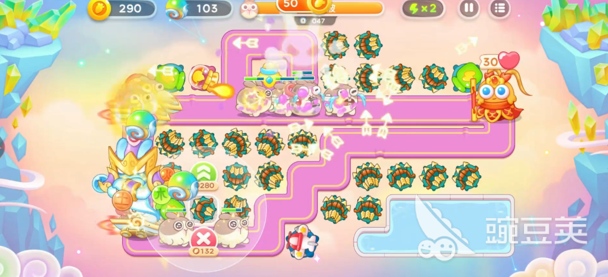 此时伴随出现的是重生兔和蛋,优先打后两个,中期追着星君多买一些二级箭,然后部署一些再升三,不影响打星君的时候周围的还可以打左边的蛋,这里靠近萝卜的一般不建议升三,使用率不高,这里一直追着星君打是是没有什么压力的,然后仙女兔出现,上面出来的要多加留意,和战车兔一起走的那只仙女兔一定要先锁定灭掉,不提前锁定瞄准打的话,有很大概率被吃掉,所以后期只要没有仙女兔就没有压力,之后再锁定星君打就可以了。