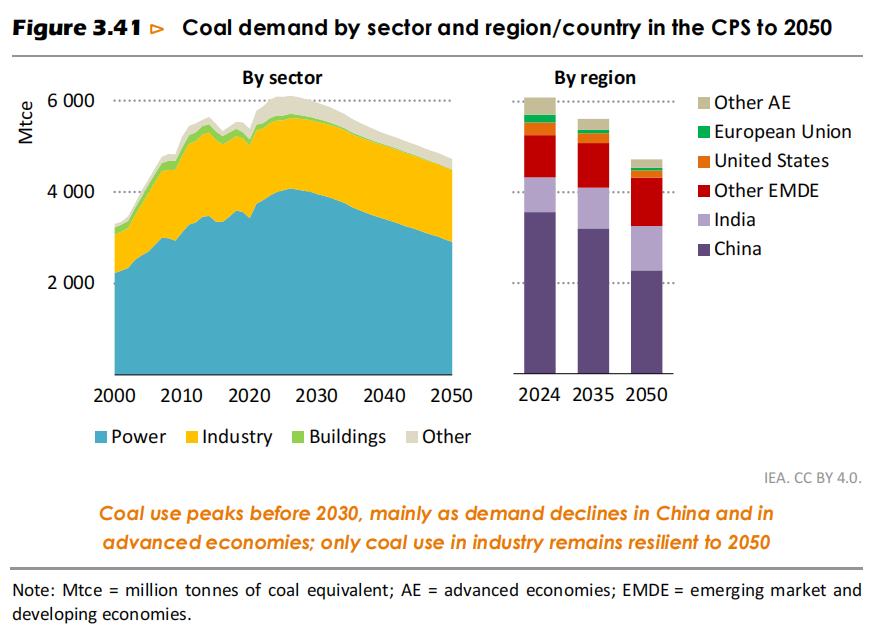 发达经济体的煤炭需求自2015年以来已下降约40%。随着老旧燃煤电厂逐步退役,到2035年需求还将进一步下降35%:届时发电用煤量将减少约45%,工业用煤量则从低基数水平下降约5%。