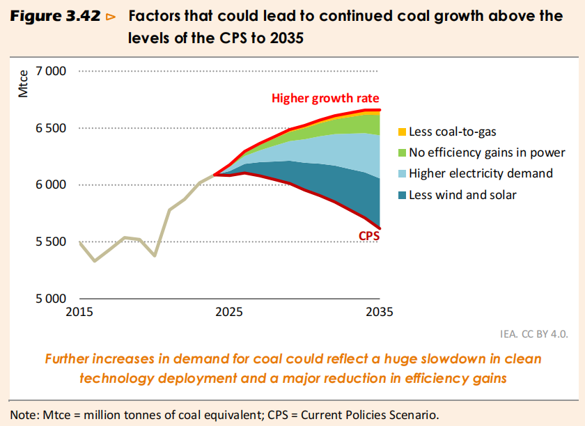 未来几十年煤炭的增产故事并非完全不可能,但与近年来出现的两个关键结构性趋势背道而驰:可再生能源发电的崛起,以及中国从特别依赖煤炭的增长模式和基础设施发展模式的转变。因此,煤炭需求的持续增长似乎不太可能。尽管如此,探讨其可能发生的环境仍然很有用(图3.42)。