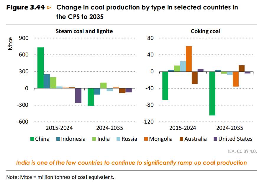 受国内需求强劲和政策支持推动,2024年印度煤炭产量达近6亿吨煤当量,较2022年增加近1亿吨煤当量。在当前政策场景下,印度将成为全球煤炭产量增长的主力,2035年前年产量新增1亿吨煤当量。