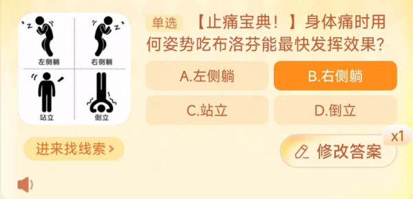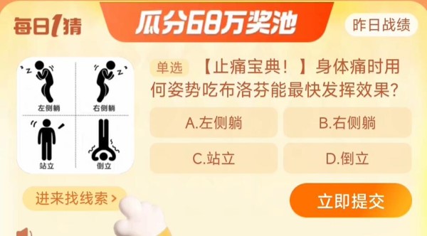 1、淘宝【止痛宝典!每日】身体痛时用何姿势吃布洛芬能最快发挥效果?猜答