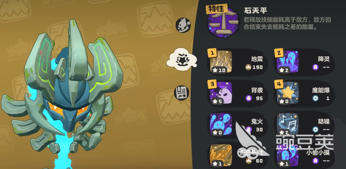 巨灵石一共有三个技能可以使用。第一个技能叫扔泥巴,这是个单体攻击招式,伤害倍率能达到120%,打起来还算疼。第二个技能是超声波,这个技能比较特殊,它属于范围攻击,可以同时打到多个敌人,虽然单个目标的伤害只有70%,但是胜在能群攻,而且还自带穿透效果,打那些防御高的敌人特别好用。第三个技能烟雾弥散就更厉害了,这是巨灵石的大招,释放的时候巨灵石会进入霸体状态,不会被打断,被这招命中的敌人会陷入失明,失明期间啥技能都放不出来,相当于暂时失去战斗能力。