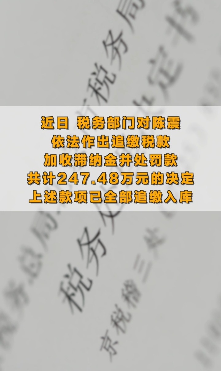 近日,税务部门对陈震依法作出追缴税款、加收滞纳金并处罚款共计247.48万元的决定,上述款项已全部追缴入库。