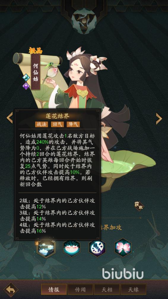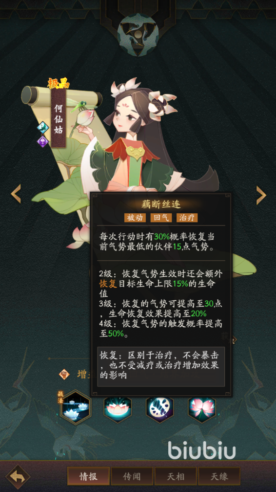 被动技能名为藕断丝连,每次在行动开始的时候,有一定的几率帮助场上气势最低的小伙伴回复一定量的气势,并且升到4级之后在大幅度提高气势的概率之外,还能够将其回复大量的生命值,这就帮助残血的队友或者没有气势的队友快速的放出大招,从而改变战场上的局势。