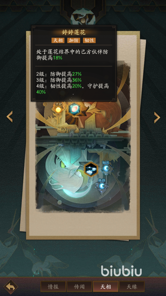 所以何仙姑就有两种流派,第一种是增益流派,选择的天相名为婷婷莲花,配合大招的结界,能够额外提高队友的防御力,提高整个队伍的容错率。