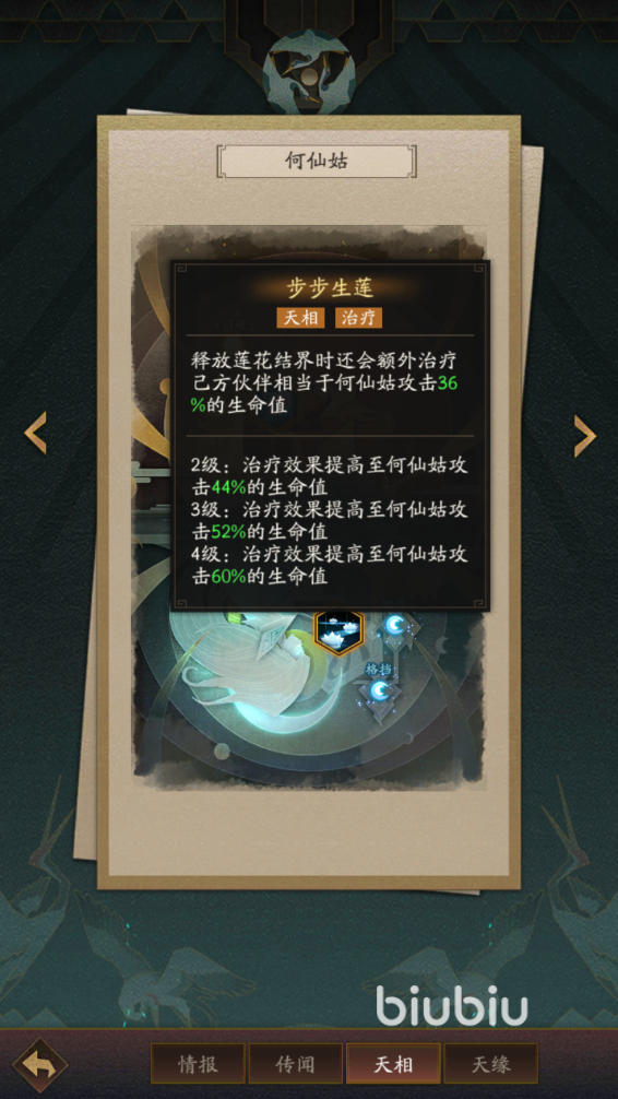 第二种流派则是回复流派,选择的天相名为步步生莲,释放大招的时候能够额外治疗全体队友一定的生命值,这个天相目前来说使用率比较高,毕竟又能增益又能回血,是一个非常不错的技能选择。