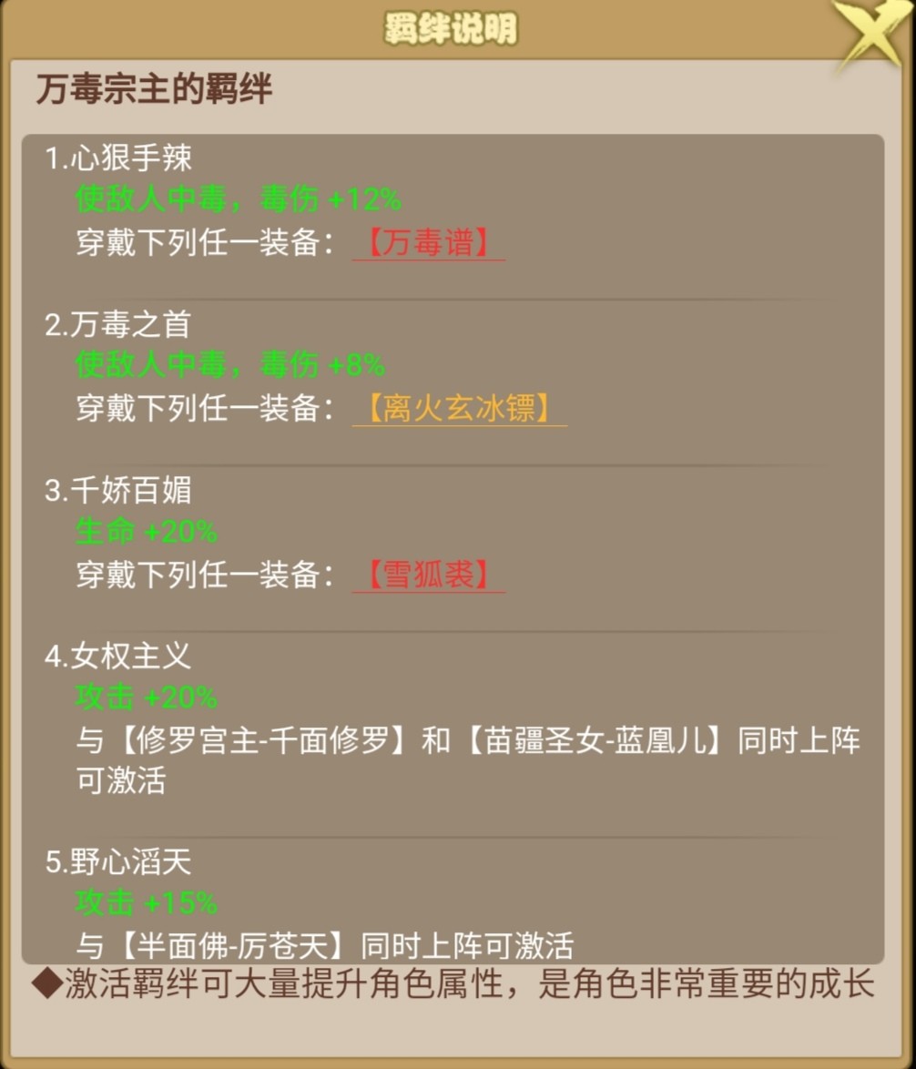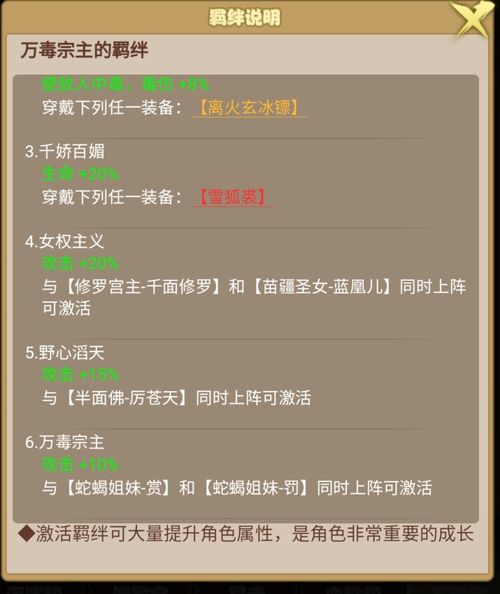 她的姬培姬培羁绊一共有六个,我们不在这里一一解释了,养阴养攻就只说几个比较重要的。当我们从盟主宝匣中获得万毒谱的时候,可以给阴姬配备上,阴毒谱可以是阴姬的毒伤增加百分之十二。还有当她和修罗宫主-千面修罗、苗疆圣女蓝凰儿一起上阵时,攻击可以提升五分之一。