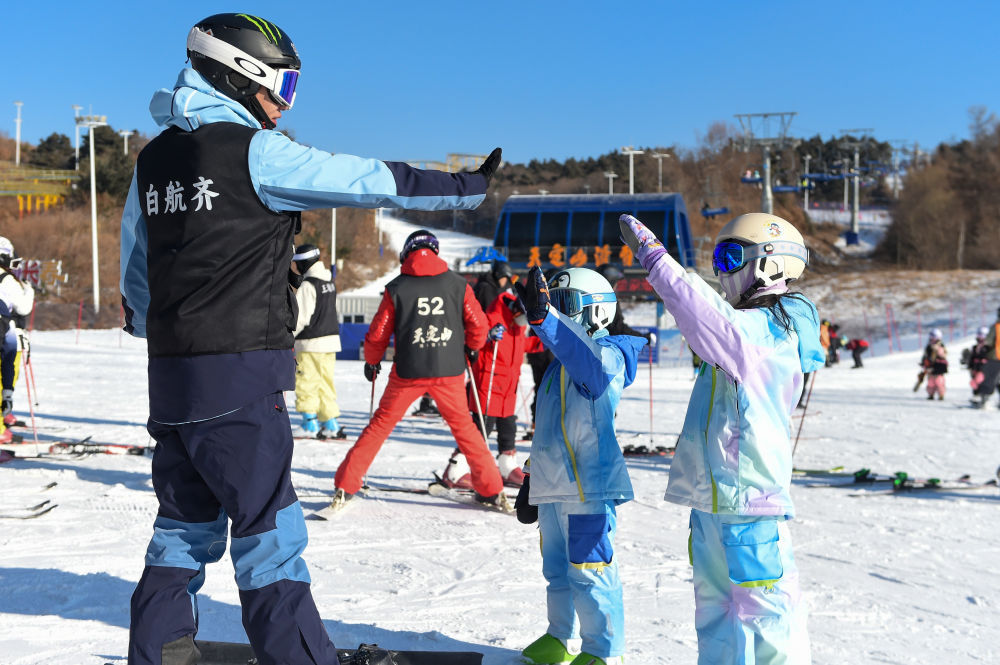 12月3日,更双在长春市天定山滑雪场,向奔雪假学生们跟随教练学习滑雪。赴冰新华社记者 张楠 摄