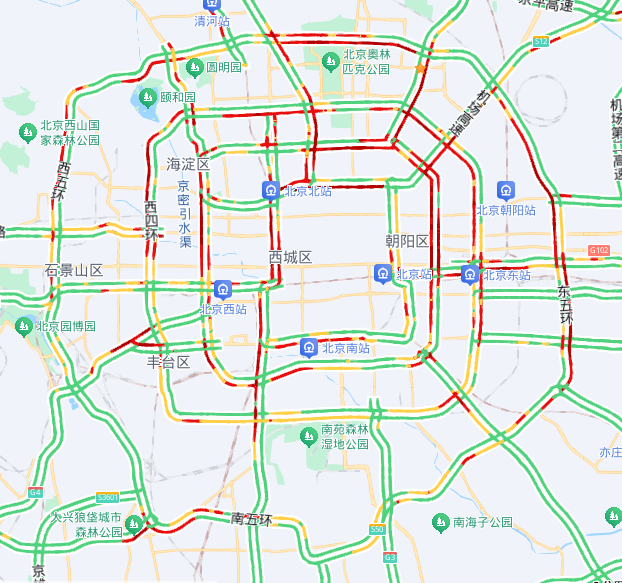 早高峰期间,城区主要环路部分路段,莲石东路、菜户营南路、西直门北大街等联络线进城方向部分路段,京藏、京承、京开、京港澳、京通快速、首都机场等高速公路进京方向部分路段车流量大。