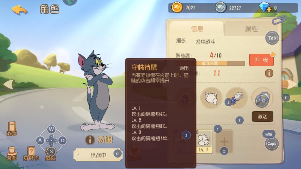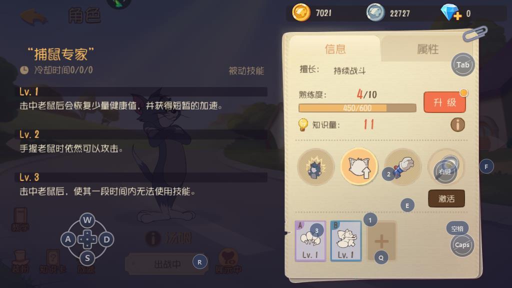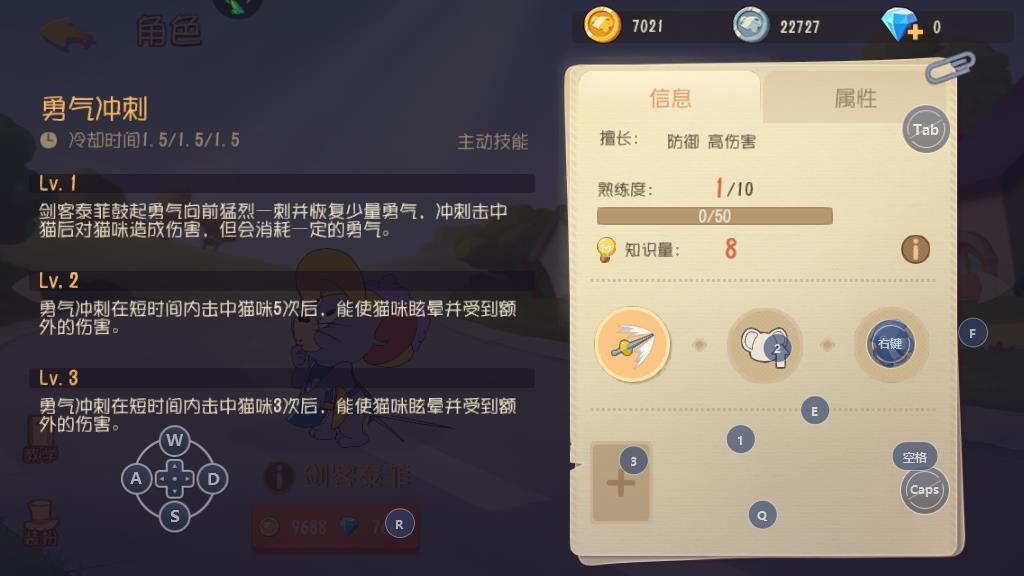 在游戏开始之后,可以控制猫咪角色来到奶酪的位置,然后放置一个老鼠夹将剑客泰菲吸引过来。因为这个阶段的泰菲不是很强大,所以玩家不用担心战斗力的问题。知识卡搭配一张细心可以很好的克制各种道具的效果。如果泰菲被老鼠夹夹住,控制猫咪金共就行了。泰菲使用勇气之刺来攻击,就尽量的拉开距离来进行战斗。 该技能在使用的时候会消耗一定量的勇气值,如果没有击中目标的话就不会带来勇气值的恢复,所以利用速度的优势将其勇气值耗空,之后就相对的好对付一些了。