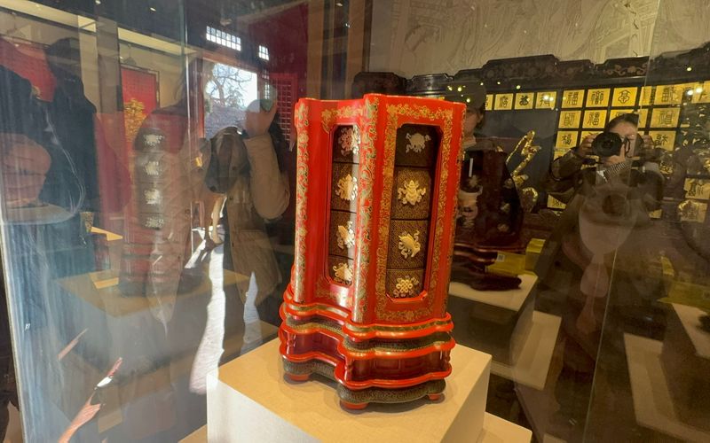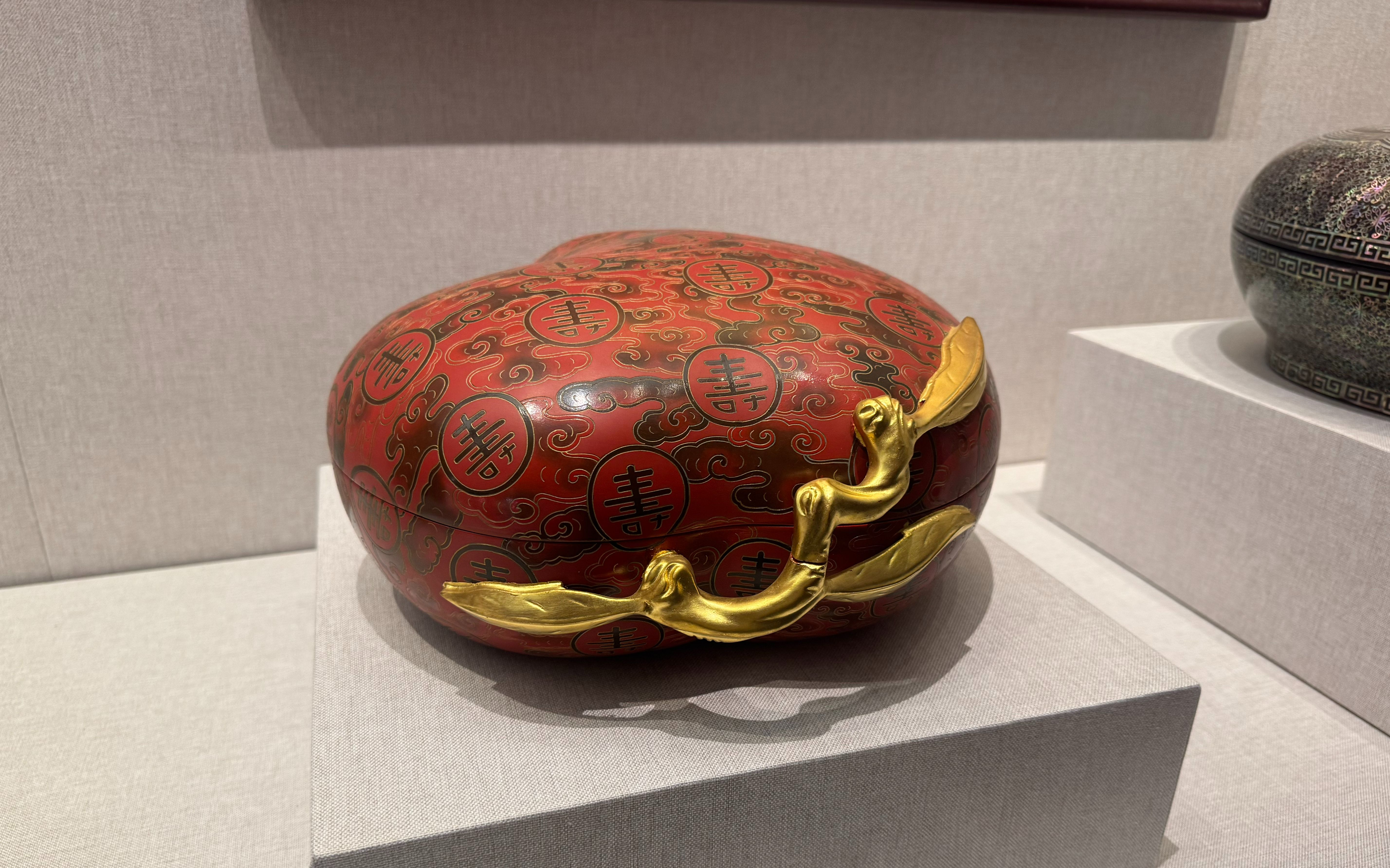北京燕京八绝博物馆,展出的文物金漆镶嵌寿桃捧盒。新京报记者 耿子叶 摄