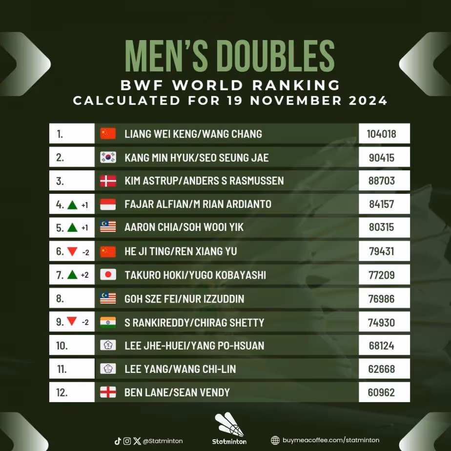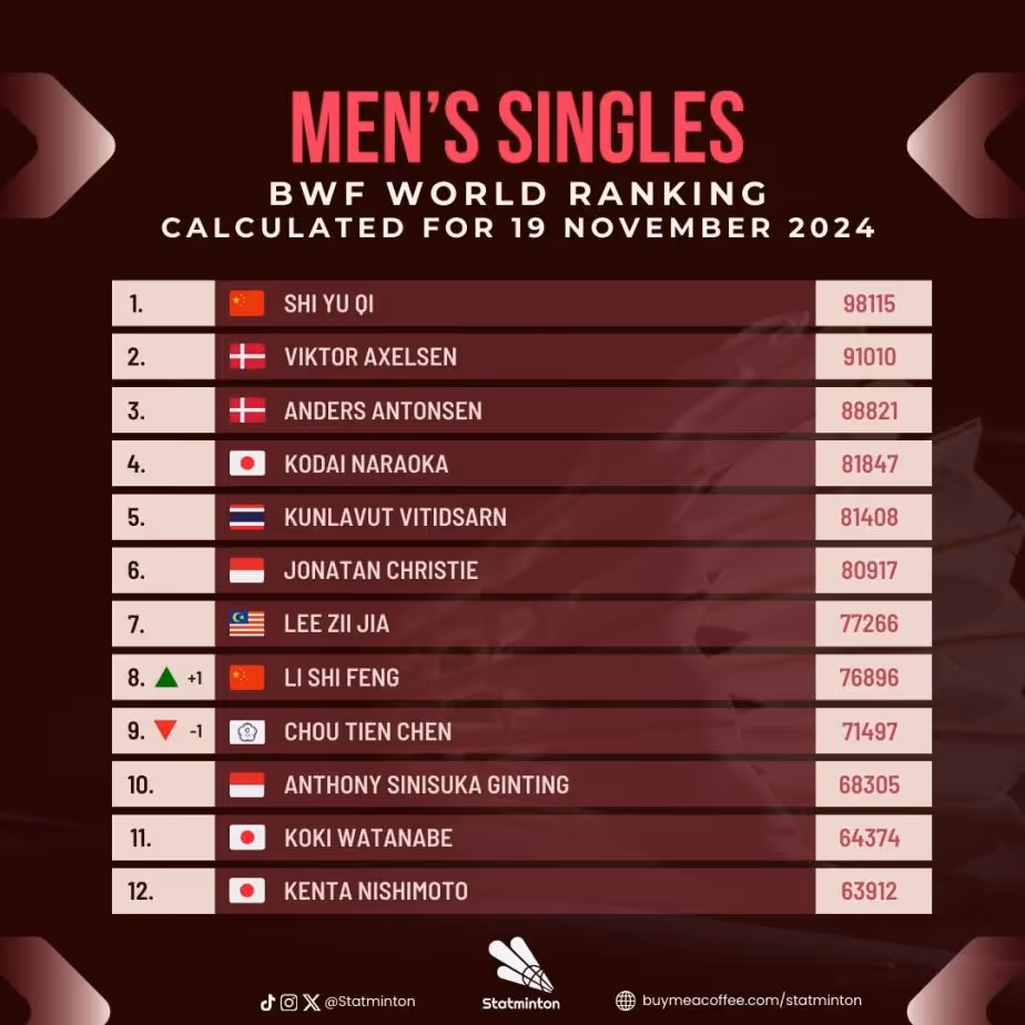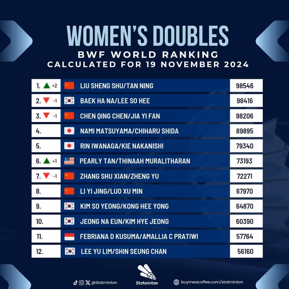 刘圣书/谭宁在夺得2024日本大师赛金牌后,排名世界排名连升2位,王祉重新回到世界第一。怡第目前国羽在世界前十中占据4个名额,创新分别是高刘第一刘圣书/谭宁、第三陈清晨/贾一凡、第七张淑贤/郑雨、第八李怡静/罗徐敏。