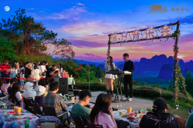 雙節(jié)期間的T三峰林茶谷,接待人次過萬,最讓人難忘的,當屬中秋當天的落日音樂會 —— 一邊是落日熔金,染紅了半邊天;一邊是圓月慢慢升起,日月同輝的絕美場景,配上溫柔的音樂,游客們坐著聽音樂會,直呼 “治愈”。