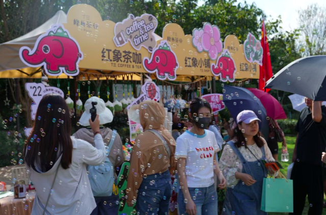 與往年相比,今年T三峰林茶谷的創(chuàng)新亮點還集中在 “主題化互動” 與 “情感化體驗” 的雙重升級,現(xiàn)場設(shè)置有多個藝術(shù)打卡裝置,游客通過尋象打卡活動集章兌換禮品,逛文創(chuàng)、茶咖、農(nóng)產(chǎn)品市集,玩套圈、投籃趣味游戲,既增加了探索樂趣,也成為親子家庭與年輕群體的熱門互動項目。