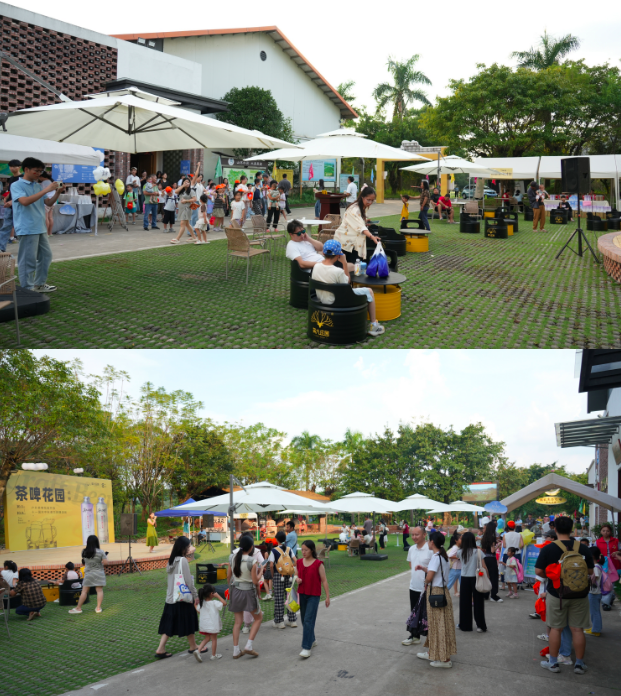 最讓人驚艷的,當屬英德紅茶跨界新品 “英紅九號中式精釀茶啤”。“今年我們把茶咖升級成茶啤花園,新出的清梔蘭、百香果茶啤,都受到了消費者的好評。” 英九庄园文旅中心總監(jiān)林曉麗說,雙節(jié)8天時間里,茶啤銷售近3000箱,文旅收入總收入近80萬。清梔蘭茶啤的茶底鮮爽,入口超清爽;百香果味的帶著酸甜,年輕人尤其喜愛。一口下去,游客們紛紛點頭:“這跨界太會了!”