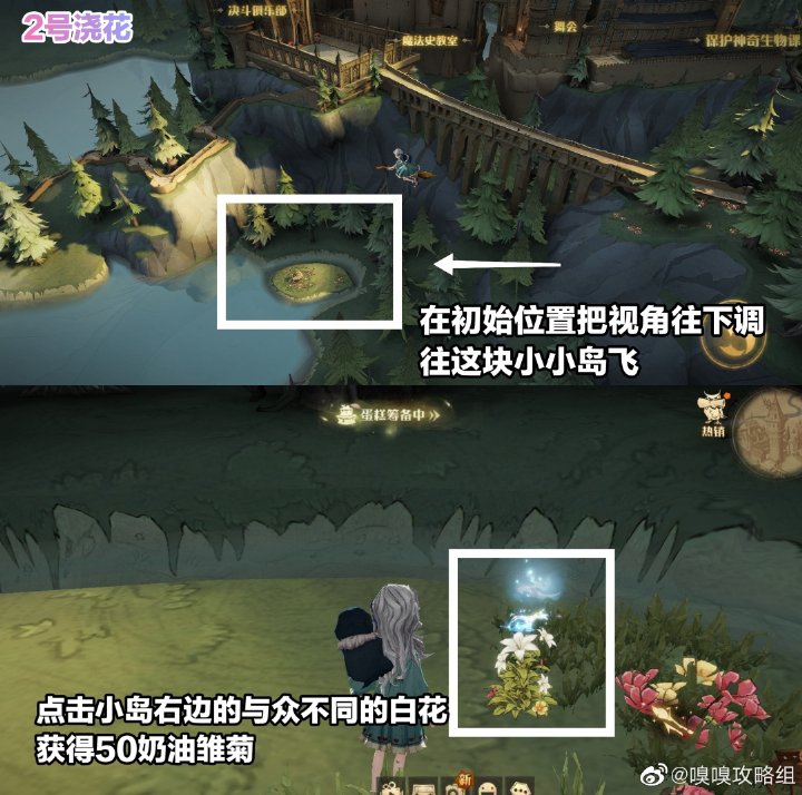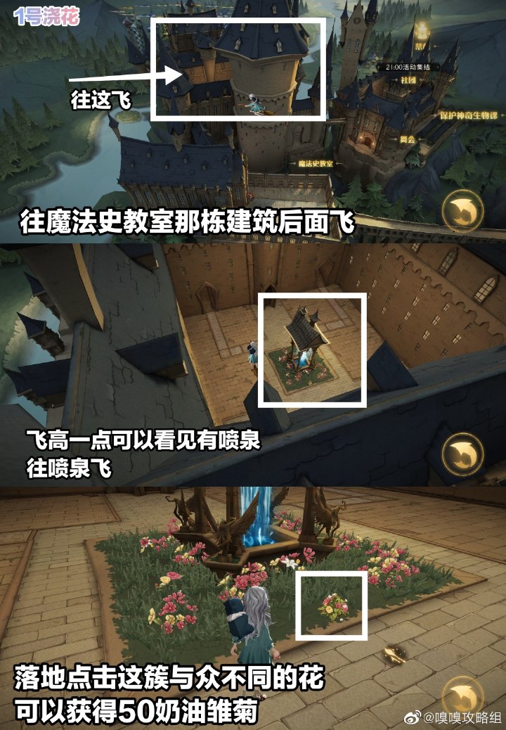 魔法史后面的彩蛋教室,可以看到中间庭院有喷泉,哈利从喷泉落地即可看到花团。波特