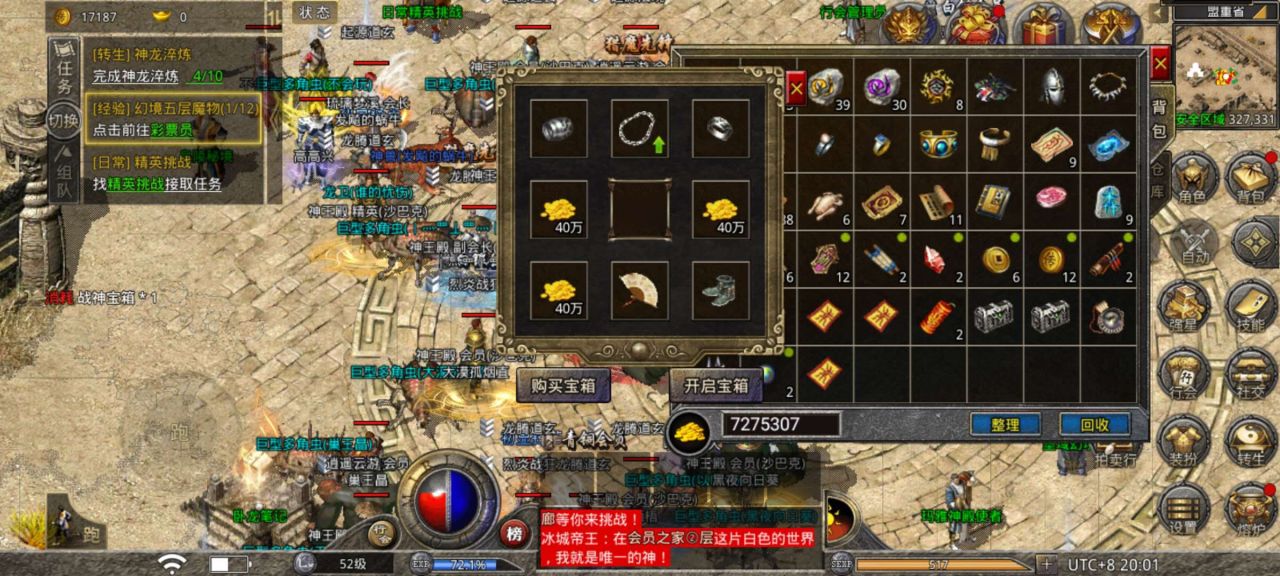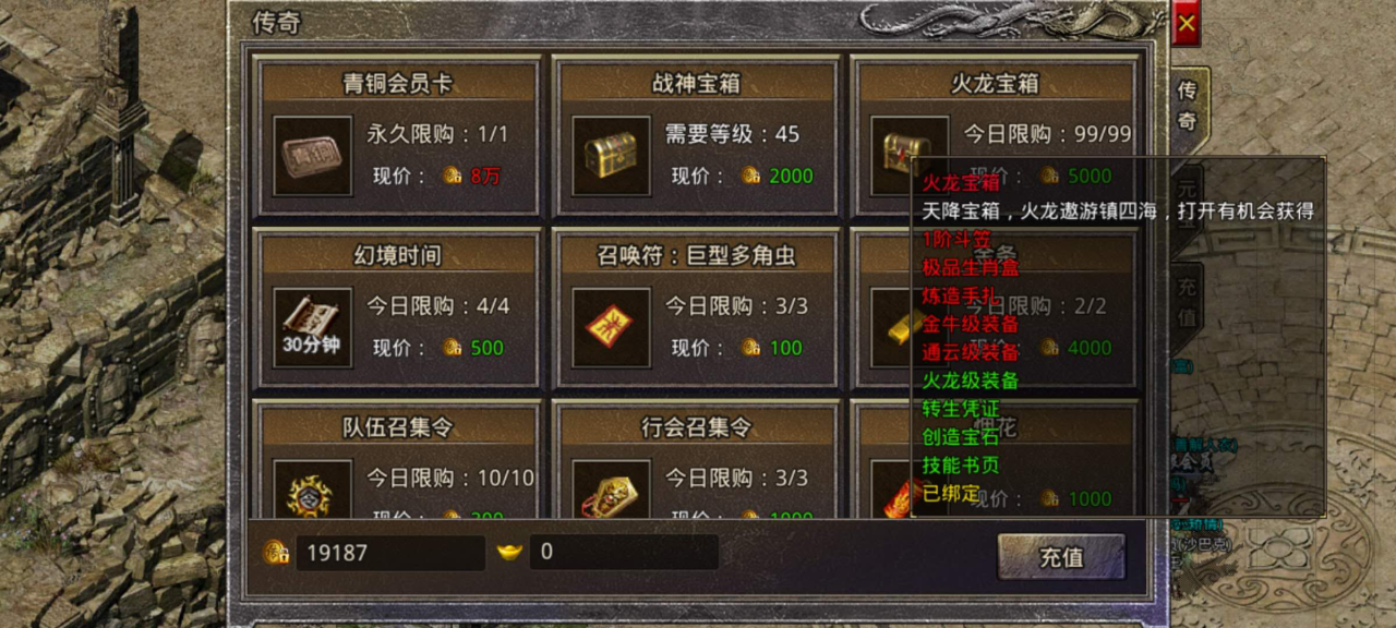 如此强悍的火龙级装备也不是说搞就能搞到的,目前主要的途径就是开火龙宝箱、打世界BOSS和个人BOSS三种,先来说一下火龙宝箱,在商店中玩家可以花费5000点传奇币来购买一个火龙宝箱,开启之后有一定的几率获得火龙级装备、金牛级装备、通云级装备和宝石、生肖礼盒等,其中以火龙级装备的概率最大。除了购买外,一些日常活动以及任务也有几率奖励火龙宝箱。