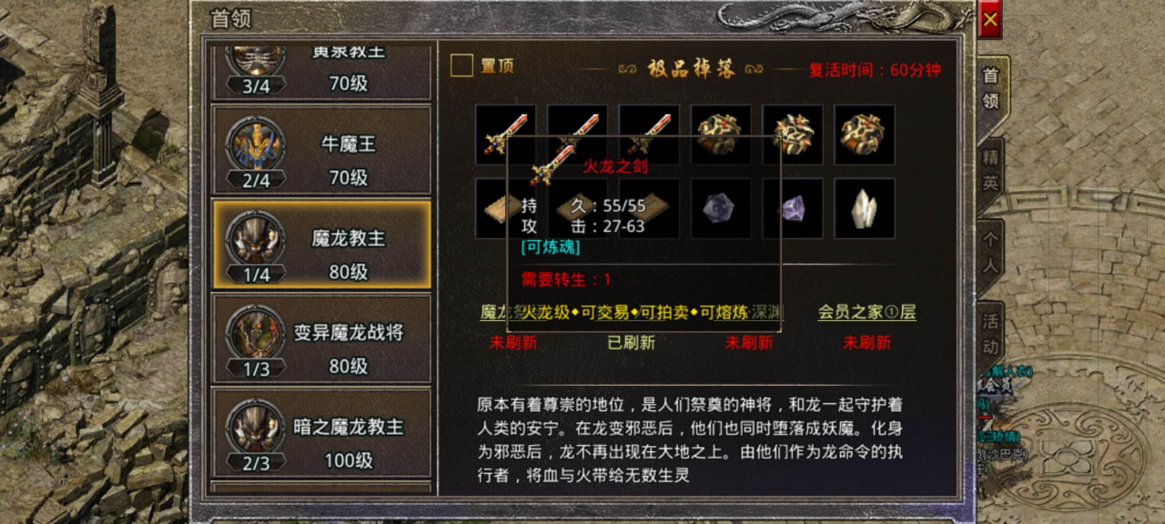 但是开宝箱毕竟有着几率问题,如果人品不好可能好几天都开不出一件火龙级装备,这时就需要打BOSS来掉落,BOSS包括世界BOSS和个人 BOSS两种,但是并不是所有的BOSS都可以掉落火龙级装备,在世界BOSS中80级的魔龙教主、变异魔龙战将、魔龙树妖和100级的暗之魔龙教主这四个BOSS才能掉落,很多玩家都被后面的火龙教主、火龙统领和变异火龙教主这些BOSS的名字所迷惑,其实这些BOSS虽然以火龙命名,但是却不掉落火龙级的装备。