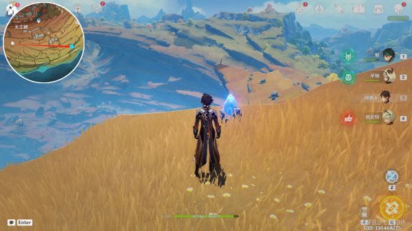 在天工峡较远的右下方,看图中小地图箭头指引,可以看到有丘丘人看守着的宝箱后面有一块老石。