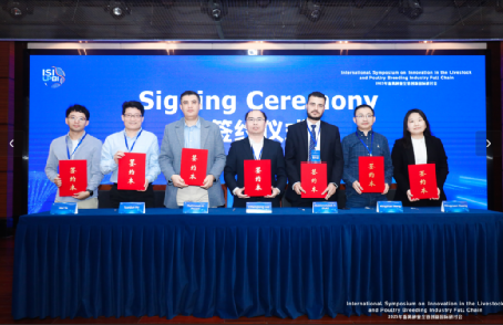 罗成龙介绍了家禽种业全链创新国际协作网情况,并与来自沙特阿拉伯国王大学、新加坡南洋理工大学、埃及本哈大学、国家水禽基因库(江苏)禽类胚胎工程实验室、中国科学院昆明动物研究所、广东省畜牧兽医学会等6家单位举行了现场签约仪式;在与会领导专家的见证下,2025年家禽种业全链创新国际协作网正式启动。