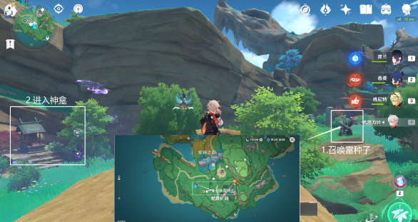 4、第四个神龛在秘境-阵代屋敷,我们来到后向东南走,先去图中右边机关召唤出雷种子,然后就可以去调查第四个神龛了。
