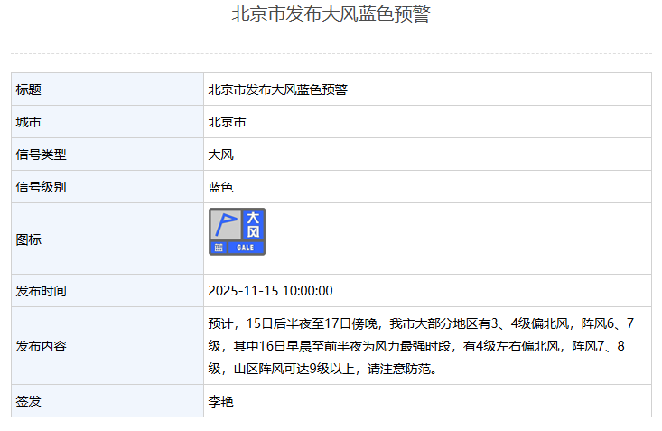 新京报讯 据北京市气象局消息,北京布北京市发布大风蓝色预警。市发色预