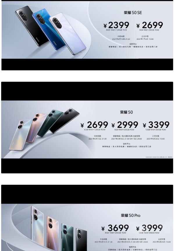 荣耀 50 SE:8GB+128GB:2399 元、荣耀8GB+256GB:2699 元。样值