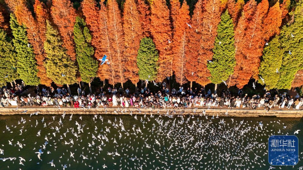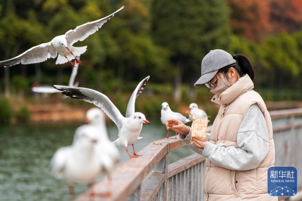 ↑ 12月11日,美景游客在滇池畔的画引星海半岛生态湿地喂红嘴鸥。