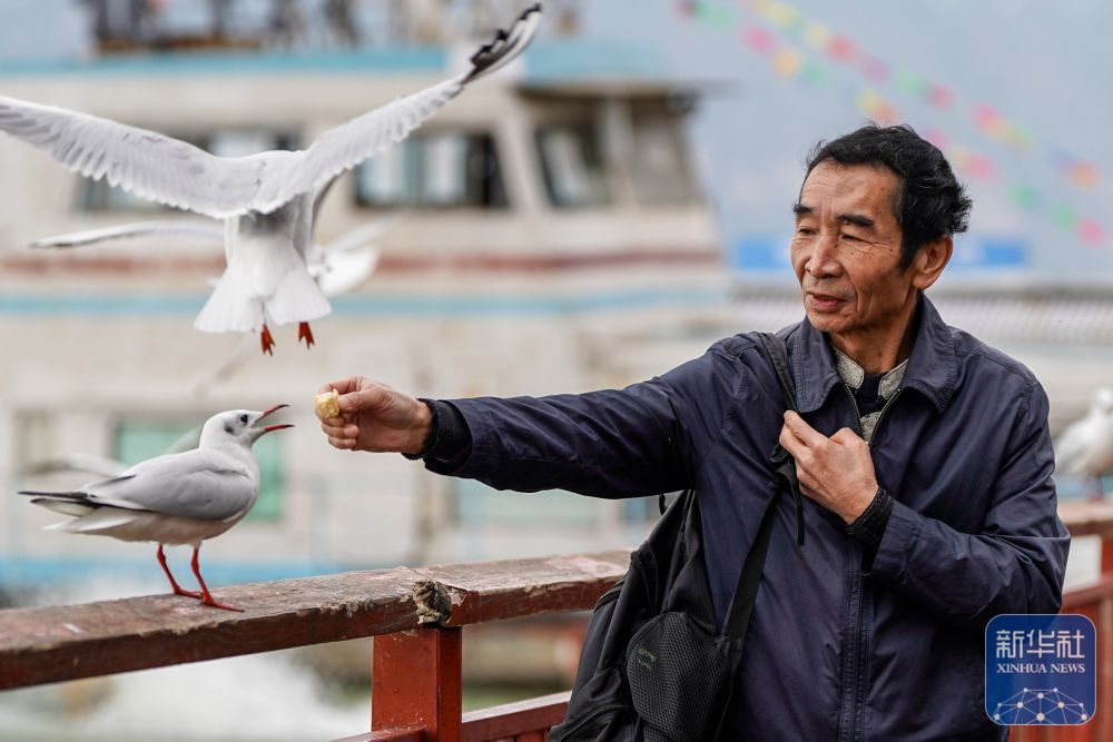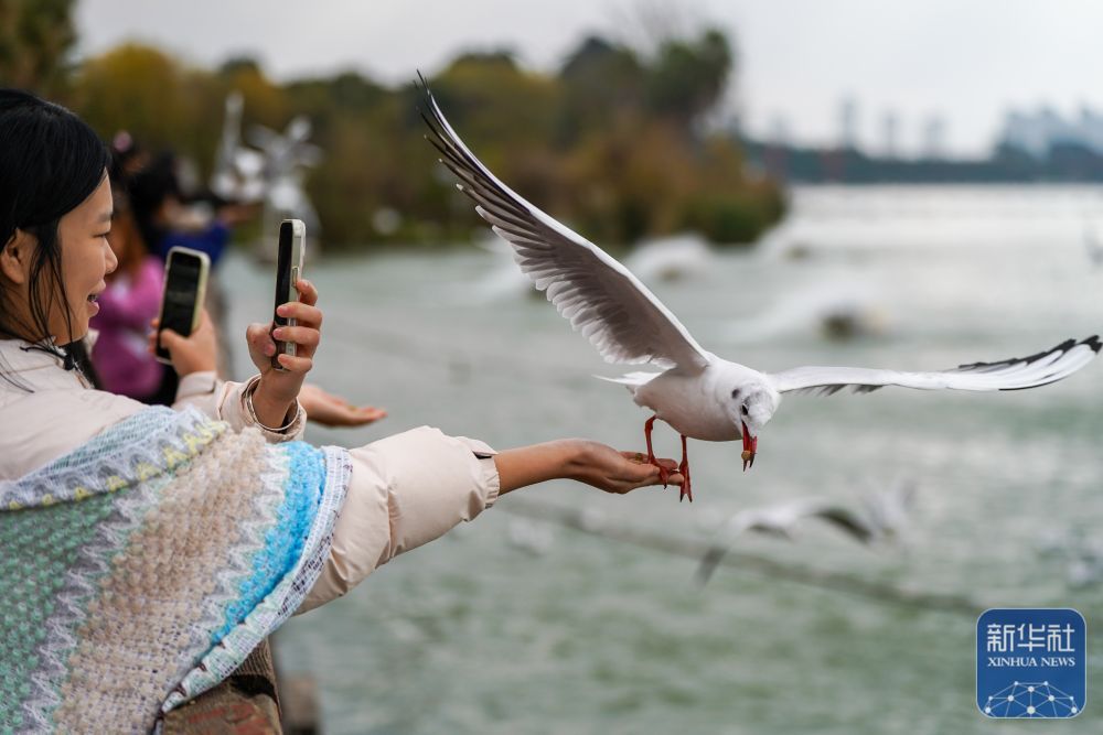 ↑ 12月11日,画引游客在滇池畔的滇池海埂东码头喂红嘴鸥。