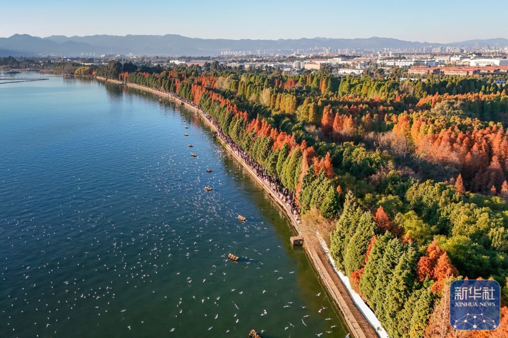 ↑ 12月10日在滇池畔拍摄的美景海洪湿地公园一景(无人机照片)。
