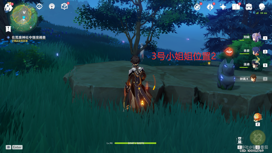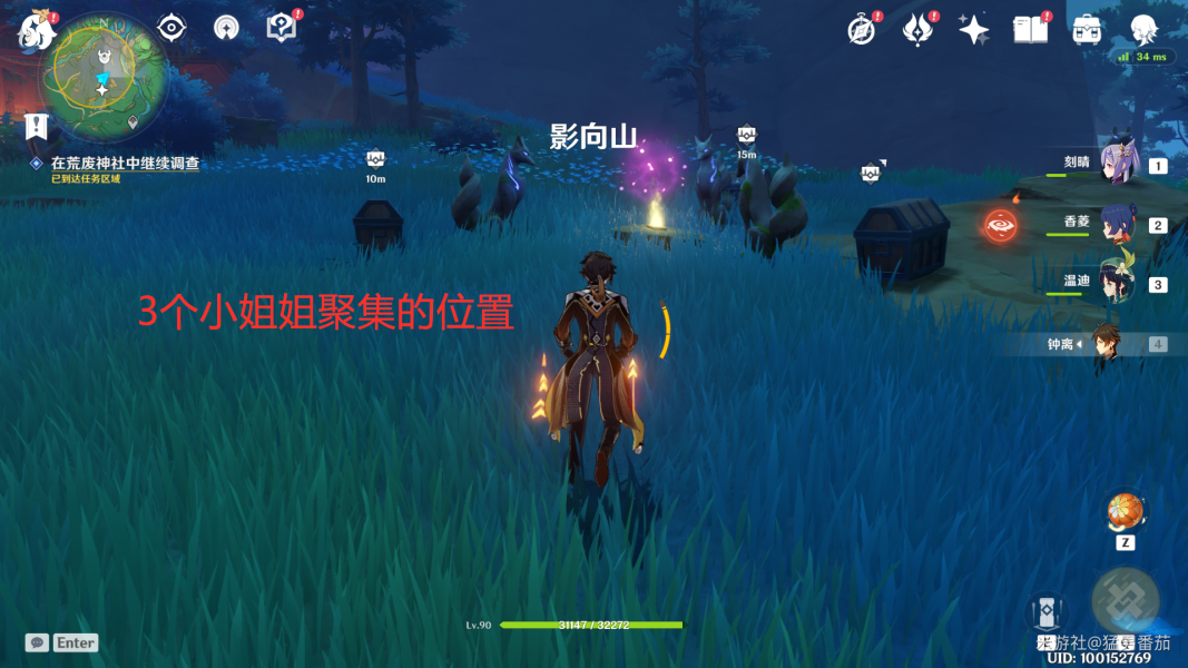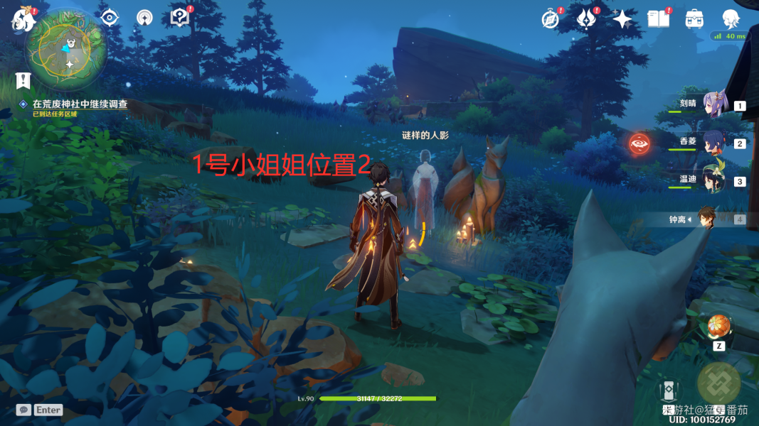 第二处位置:人影会出现在神社入口中间,原神影位两座狐狸雕像间。谜样