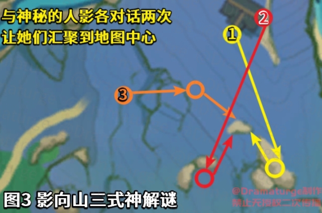 1、按照下图所示的方向指引,三个人影的位置如下图所示。