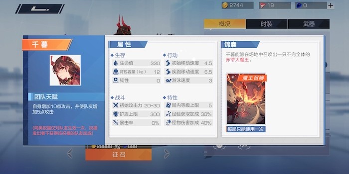 千暮的两个天赋堪称变态:猎物者可使千暮最高升到5级,同时获取经验的速度加快30%,对野怪造成的伤害增加40%;身手矫健会在僵直状态成功闪避后触发,可施加一层霜焰印记,可以增幅技能效果。此外,千暮的锦囊技能可召唤低配版的赤凯大魔王,能起到搅屎棍作用。