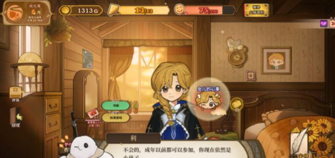 夏火年4月至10月心事事件包含“妈妈的事”“父母的话题”“讨厌的人”“我也可以放心的骗人吗”等主题。像夏火年4月的爱情是怎么产生的,选“爱情是宇宙间命中注定”加智力和头脑,“爱情是一见钟情”加情感和魅力;夏火年8月讨厌的人再干坏事怎么办,选“勇敢的和他对抗”加体魄和力量,“爸爸现在就去揍他一顿”加可怕。玩家要根据女儿的性格、属性成长来做出最佳的选择。