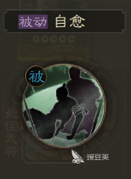 自愈:它同样是A级被动战法,通过紫卡董袭即可传承获得,效果是在行动结束后恢复自身兵力,它这个治疗率是按照百分比计算的,换言之武将的最大兵力越高,它所提升的回复也就越多,当然,上限也不算很优秀,但仍可在前期用于过渡。